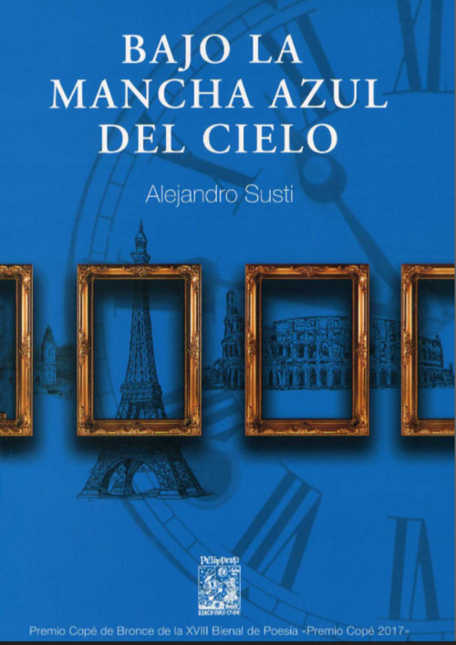 Bajo la mancha azul del cielo de Alejandro Susti, libro ganador de Premio Copé de Bronce de la XVIII Bienal de Poesía «Premio Copé 2017», hace un rico juego de intertextualidades y dialoga con la historia de Occidente. Los poemas reconstruyen el pasado de Francia o Italia por medio de figuras ilustres como Charles Baudelaire o César Vallejo, sobre la base del empleo de la prosa poética con un tono laudatorio, pero mesurado. El libro se divide en dos secciones sin título. La primera reúne nueve poemas; la segunda, diecisiete.