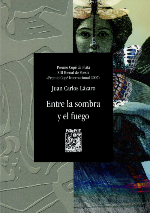 Entre la sombra y el fuego no es un libro de un solo discurso poético, sino de registro variado, organizado en cinco secciones, cuyos temas giran en torno a dos tópicos constantes: la soledad (sombra) y la pasión (fuego): «Migraciones y exilios», «Entre la sombra y el fuego»; «Animales, objetos y fantasmas», «Nowhere» y «Una temporada con Rimbaud en los desiertos de África». Otro rasgo por destacar, característico de este autor, es la autonomía que le confiere a cada uno de sus textos, los cuales pueden leerse independientemente del conjunto dentro del cual se inscriben. Esta característica, que en otros expresaría carencia de conjunto o unidad, le confiere virtudes de pluralidad temática, estilística y formal. Con esta colección de poemas, Lázaro obtuvo la Plata de la XIII Bienal de Poesía «Premio Copé Internacional 2007».