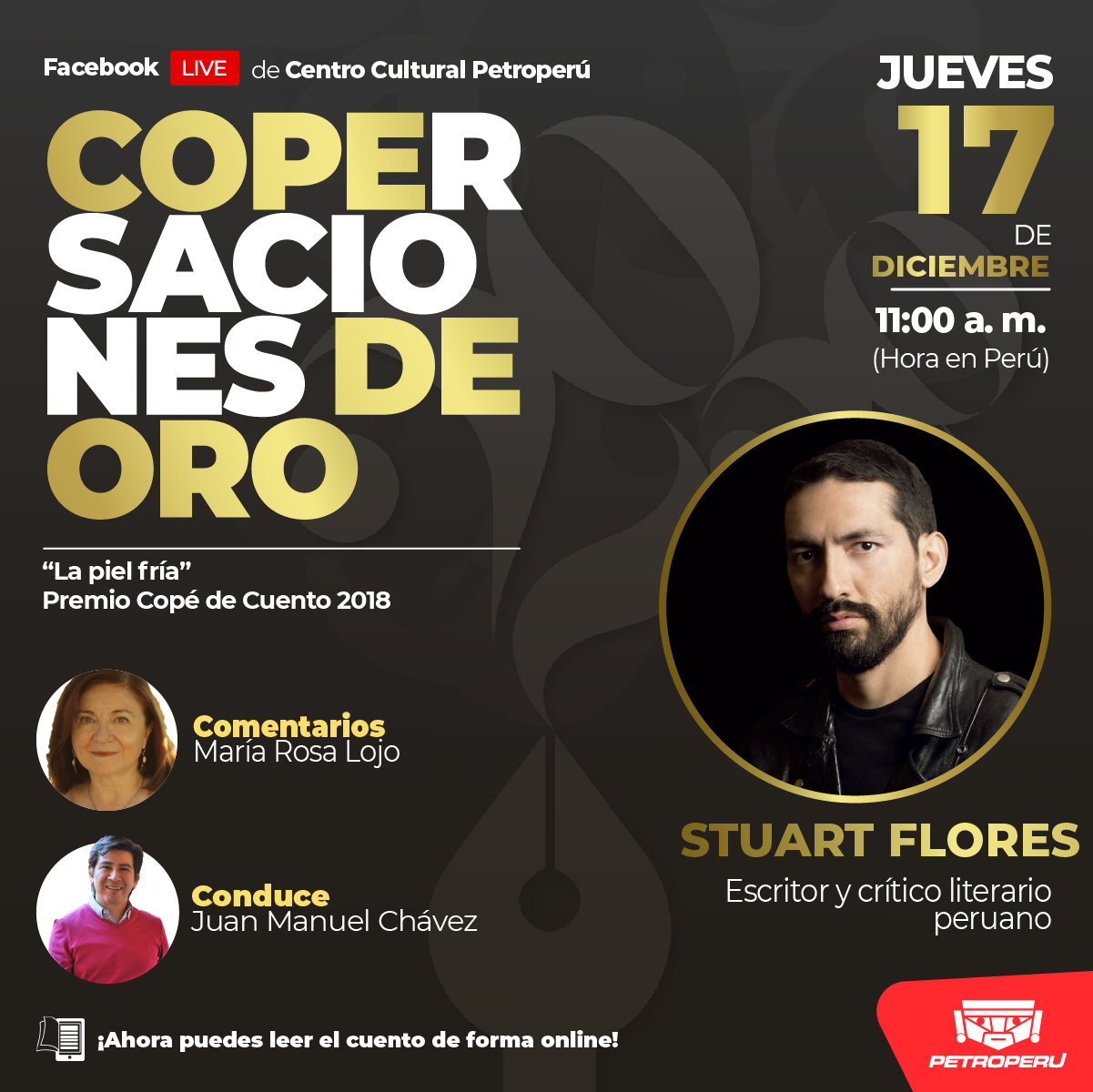 El jueves 16 de diciembre a las 11 am. vía el facebook live del Centro Cultural PETROPERÚ se realizará la entrevista al ganador del Premio Copé de Cuento 2018, el escritor Stuart Flores, por su obra “La piel fría”. La entrevista estará a cargo del también escritor e investigador Juan Manuel Chávez y los comentarios por la destacada doctora en letras argentina María Rosa Lojo. Cabe señalar que en esta fecha la comentarista intervendrá en vivo por streaming con el conductor del programa.