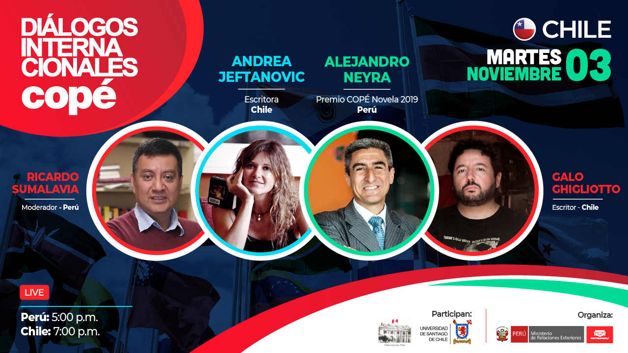 Este martes 3 de noviembre se llevará a cabo una nueva cita del ciclo “Diálogos Internacionales Copé”, con destacados escritores chilenos, a las 5 pm. hora de Perú y bajo el apoyo de la Universidad de Santiago de Chile.