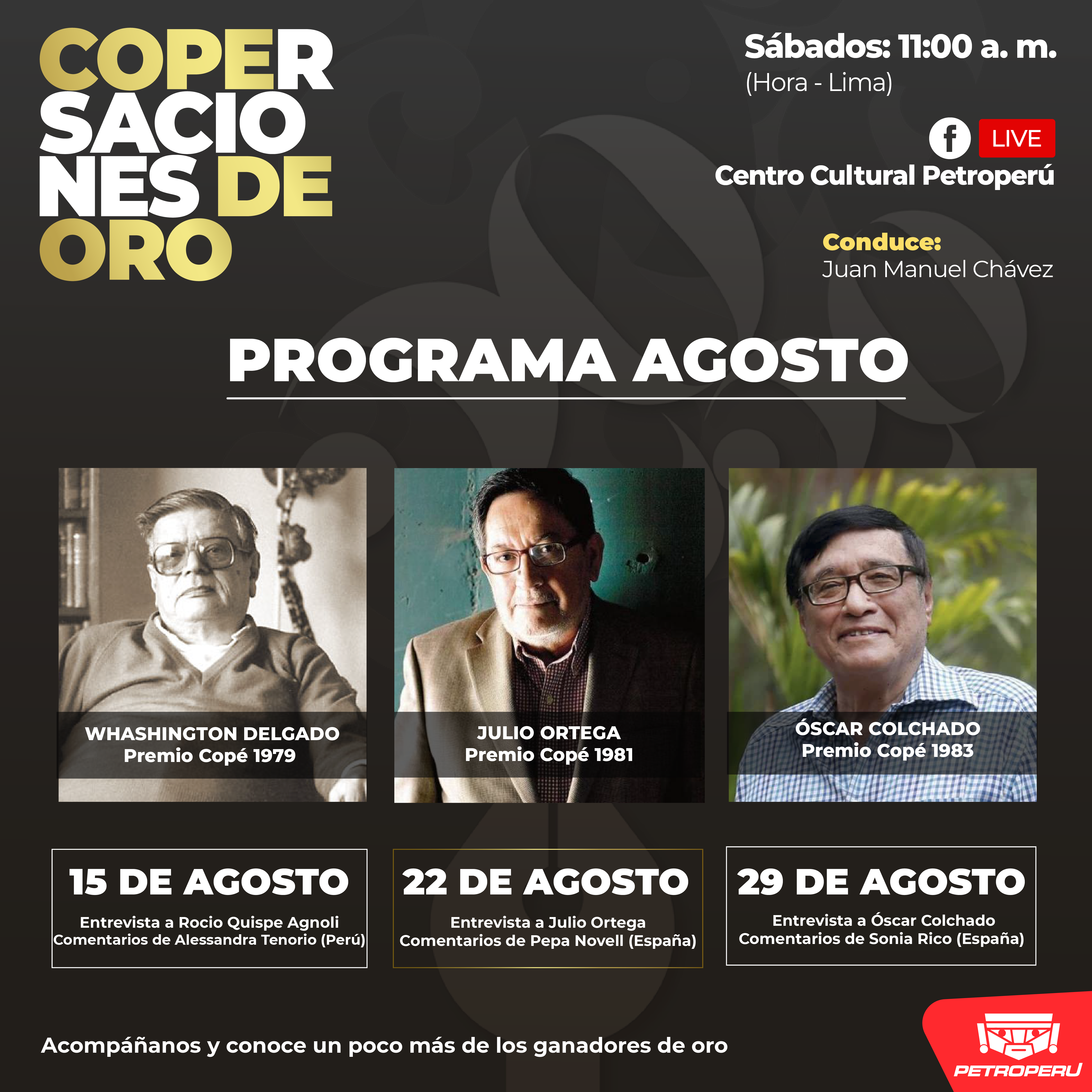 Finalmente, el sábado 29 de agosto se entrevistará al poeta, cuentista y novelista Óscar Colchado, Premio Copé de Oro 1983 con los comentarios de Sonia Rico (Psicóloga, escritora y coach transformacional).