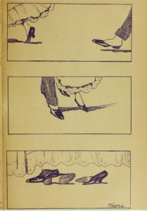 En abril de 1906, se publicó un dibujo maravilloso de Julio Málaga Grenet, sin una sola palabra, una narración visual en tres actos desde la perspectiva de los zapatos de los amantes (N.º 18, p. 3). Un hito en la historia gráfica de lo social, pues por primera vez se evoca inequívocamente, con gracia y delicadeza, la representación del acto sexual en una publicación. Aquí se exhibe el deseo sexual moderno sin ambages. Esto significa que el dibujante, la revista y los lectores/espectadores coincidían ya en una nueva sensibilidad, pero es este dibujo en el que se produce el encuentro de las representaciones con la práctica social y las expectativas culturales. Así, como el poema “Misa negra” (1893) de Tablada causó escándalo y rechazos morales en la ciudad de México, podemos imaginar los chismorreos de las beatas limeñas ante este formidable dibujo.