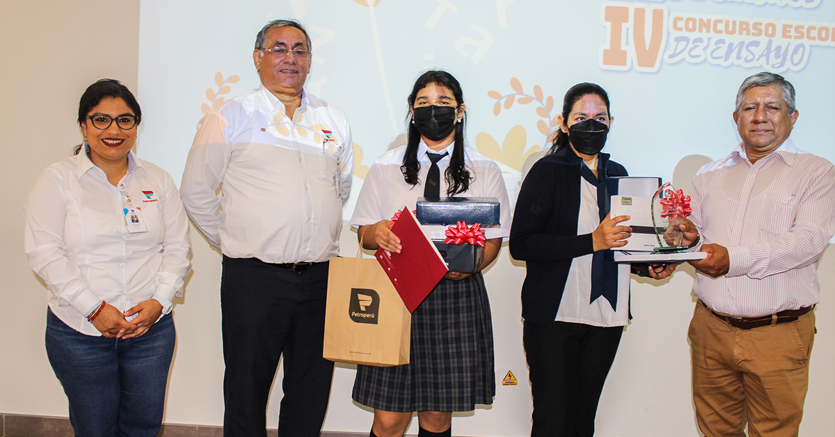 En el concurso de Ensayo Literario el primer lugar lo obtuvo Jefferson Jesús Alcarraz Nizama, alumno de la Institución Educativa Particular Federico Villarreal, con el ensayo titulado: “Refinería Talara, cambio en la vida de los peruanos”. El segundo lugar, fue para la estudiante Elena Santiago Cruz de la Institución Educativa 15508 Domingo Savio, quien también fue premiada por su trabajo “Construyendo un mejor futuro”. Ellos fueron reconocidos junto a sus profesores asesores y directores con diplomas, trofeos y artículos de tecnología por su excelente desempeño.