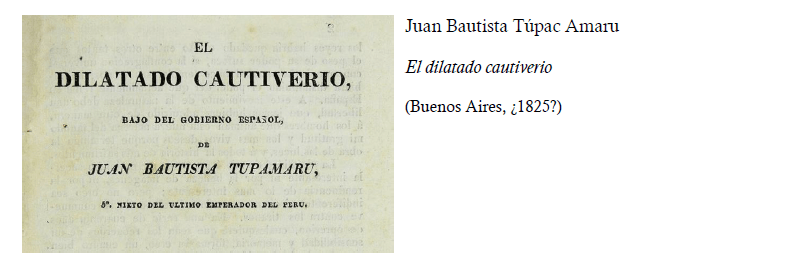 Conversatorio/conferencia sobre la vida, exilio y trascendencia de Juan Bautista Túpac Amaru (hermano de Túpac Amaru), a partir de sus documentos memoria y escritos a los pocos años de la independencia del Perú. Se abordará su propia obra El dilatado cautiverio (Buenos Aires, ¿1825?) donde se plantea cuestiones esenciales sobre la identidad, la nación y el paso a una vida republicana, tanto desde el ámbito sociopolítico como el cultural. La vigencia de este documento es fascinante e indiscutible porque describe la reclusión y demanda el anhelo de libertad. El rescate bibliográfico está ligado a la difusión de la publicación El dilatado cautiverio en formato digital.