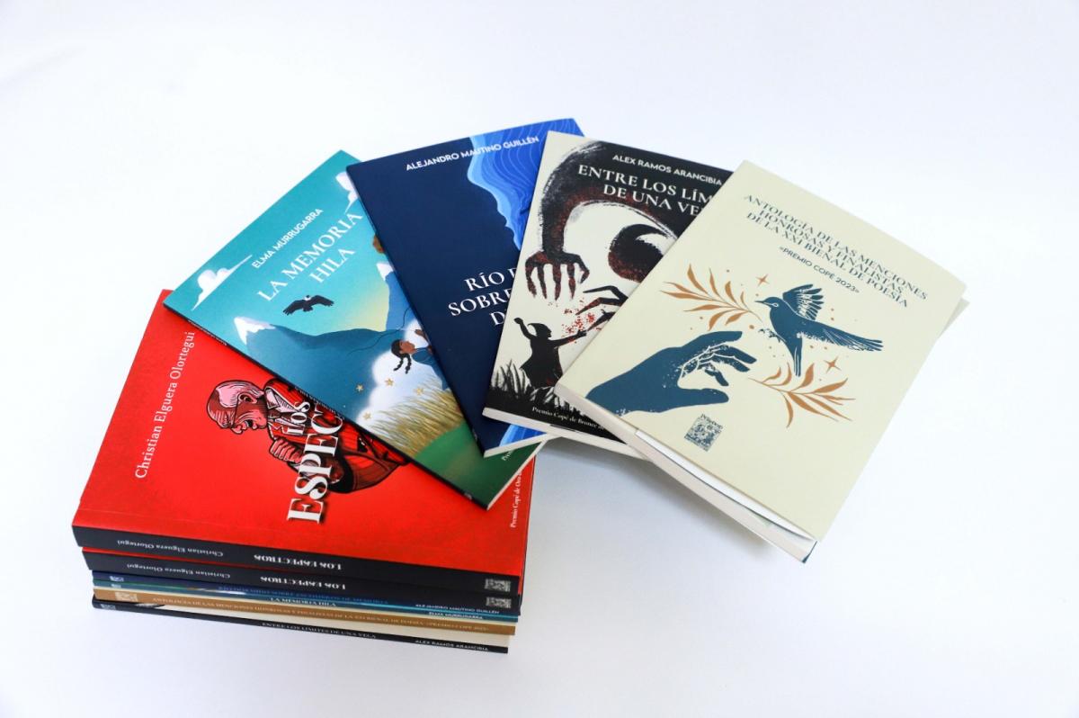Los libros, publicados bajo el sello Ediciones Copé, incluyen “La memoria hila” de Elma Murrugarra (Copé Oro de Poesía), “Río dormido sobre escombros de memoria” de Alejandro Mautino Guillén (Copé Plata de Poesía), “Entre los límites de una vela” de Alex Ramos Arancibia (Copé Bronce de Poesía), una antología de menciones honrosas y finalistas de la XXI Bienal de Poesía, y la novela “Los espectros” de Christian Elguera (Copé Oro de Novela). Los comentarios de las obras estarán a cargo del destacado crítico literario Ricardo González Vigil y los autores leerán fragmentos de sus obras.