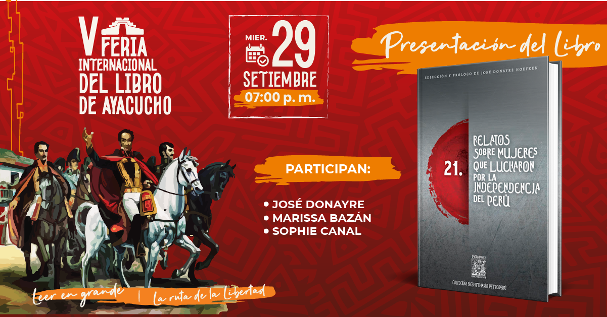 El miércoles 29 de setiembre a las 7:00 p.m. se presentará el libro “21. Relatos sobre mujeres que lucharon por la independencia del Perú”, con la participación de Marissa Bazán y Sophie Canal, junto a José Donayre Hoefken, responsable de la selección y prólogo del libro.