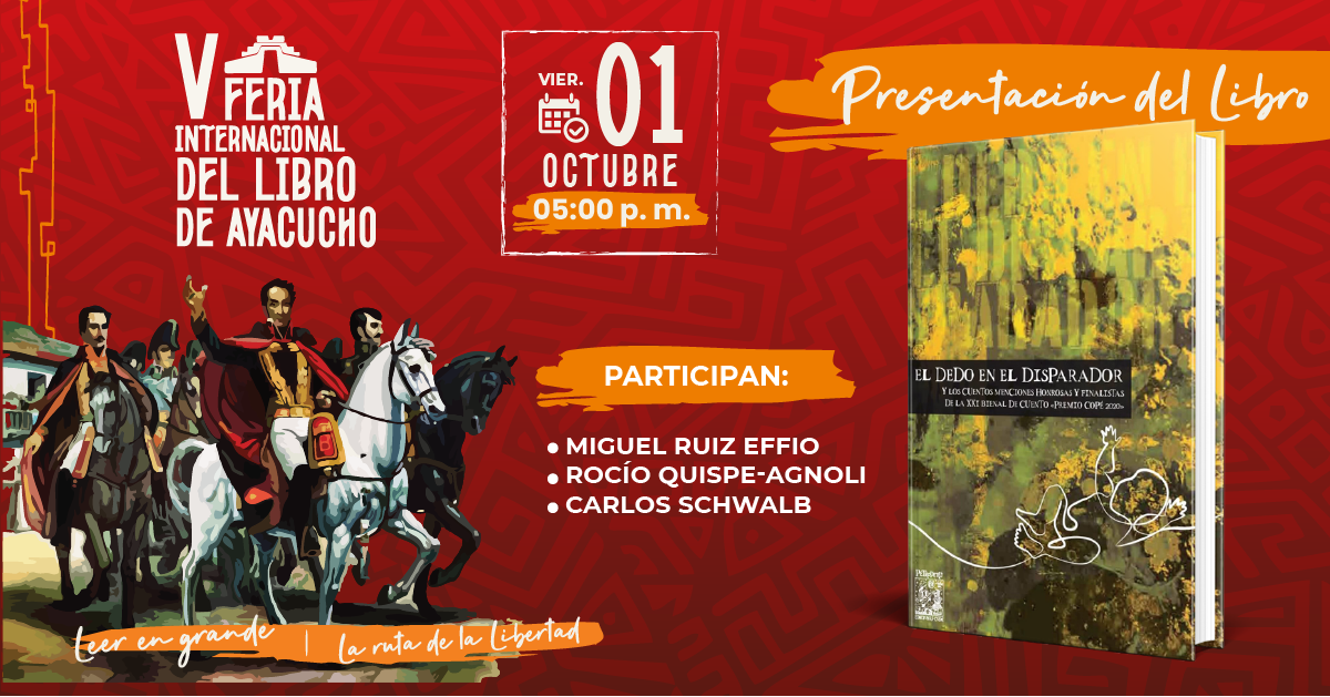 El viernes 1 de octubre a las 5:00 p.m. se presentará el libro “El Dedo en el disparador y los cuentos Menciones Honrosas y Finalistas de la XXI Bienal de Cuento Premio Copé 2020”. Intervendrán en esa jornada Miguel Ruiz Effio, Premio Copé de Cuento 2020, Rocío Quispe – Agnoli, catedrática de estudios coloniales hispanoamericanos, en el Departamento de Estudios Romances y Clásicos de Michigan State University y Carlos Schwalb Tola, escritor, investigador y Premio Copé de Cuento 1996.