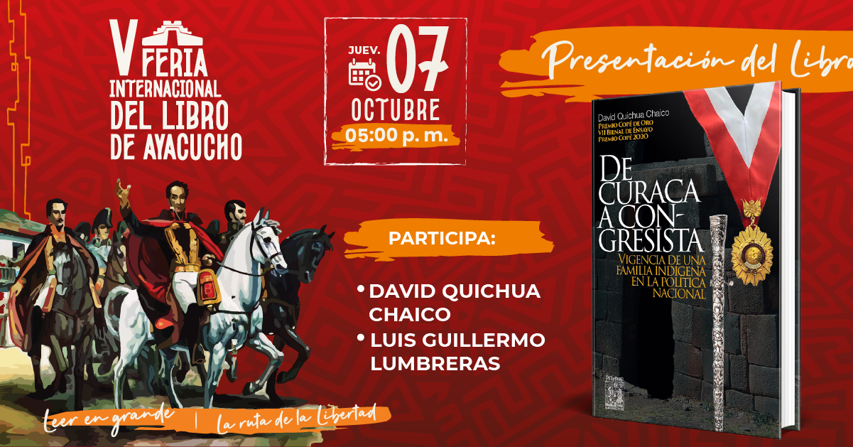 Finalmente, el 7 de octubre a las 5:00 p.m. se presentará el ensayo ganador del Premio Copé 2020, “De curaca a congresista. Vigencia de una familia indígena en la política nacional”, del historiador y docente David Quichua Chaico, quien estará acompañado de investigadores de la Universidad San Cristóbal de Huamanga.