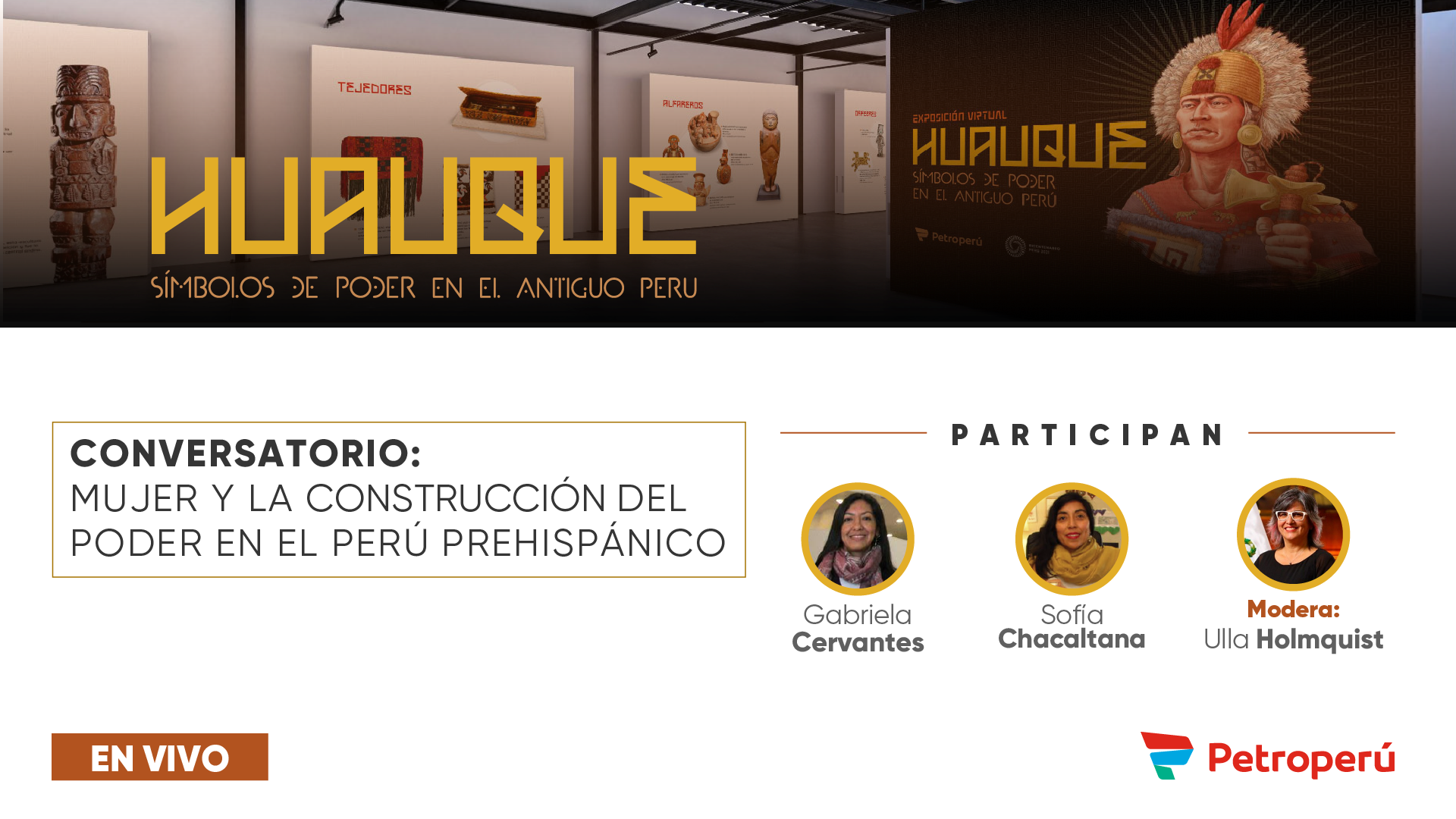 Como parte de la exposición virtual denominado “Huauqe. Símbolos del poder en el antiguo Perú”, el Centro Cultural Petroperú invita al primer conversatorio denominado “Mujer y la construcción del Poder en el Perú Prehispánico”. El acto se realizará el martes 23 de noviembre de 2021 a las 7 pm, vía el Facebook live del Centro Cultural Petroperú con la participación de las destacadas investigadoras Ulla Holmquist, Sofía Chacaltana y Gabriela Cervantes.