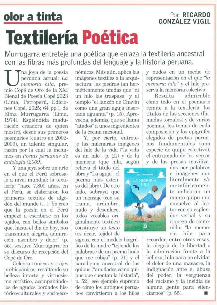 Agradecemos al destacado crítico literario Ricardo González Vigil por su artículo publicado en la revista Caretas, dedicado a La memoria hila, el poemario de Elma Murrugarra, ganador del Premio Copé Oro 2023.
